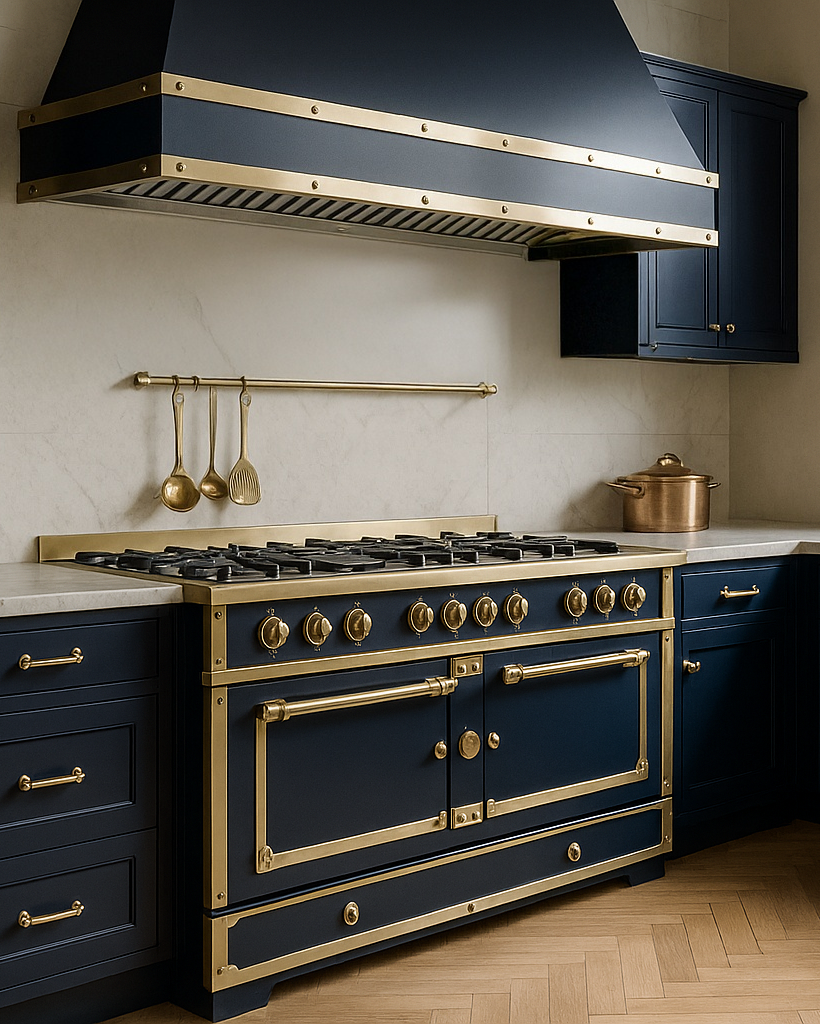 Deep maroon enamel paired with brushed brass detailing creates a strong architectural centerpiece rooted in Italian design tradition. A statement cooking suite that balances heritage character with modern performance.